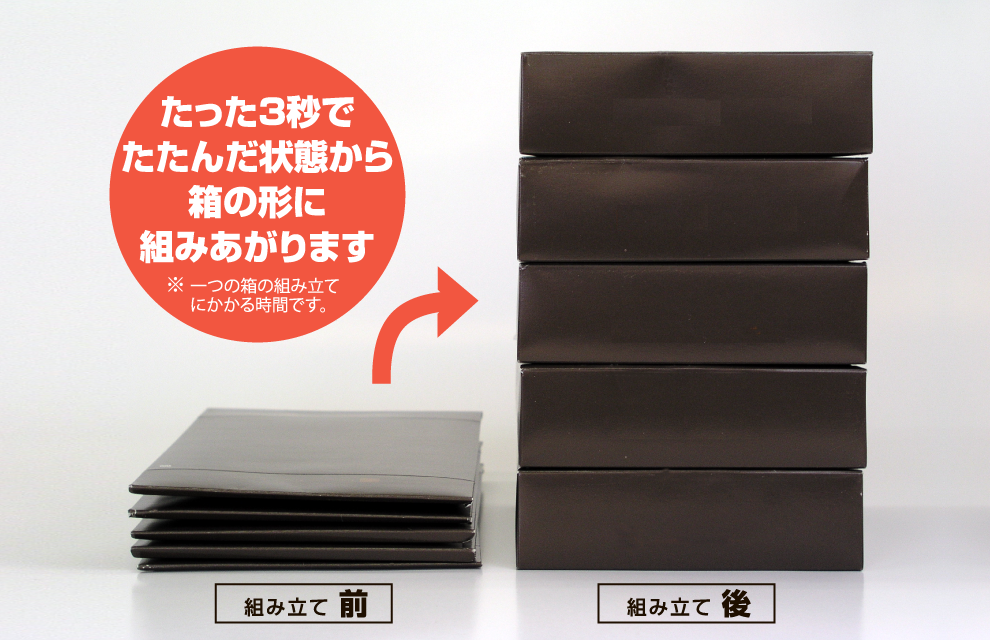 テイスティのワンタッチ箱は、一瞬で組み立てられ、コストも節約できます。包装・充填