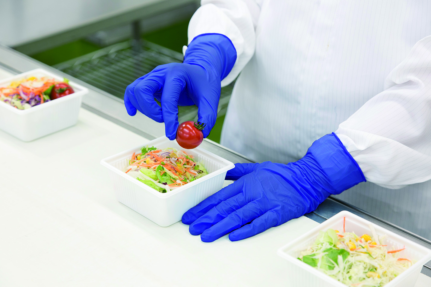 薄手ながらに高い強度と伸縮性があり、優れた装着感・フィット感で細かな仕分け作業やトッピング工程などに適したニトリルグローブ。濃いめのブルーカラーでラインごとの使い分けにもおすすめです。