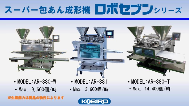 スーパー包あん成形機ロボセブンシリーズは、小型機から大型量産機まで取り揃え、豊富な後続装置やオプションにより、魅力ある商品をご提案します。