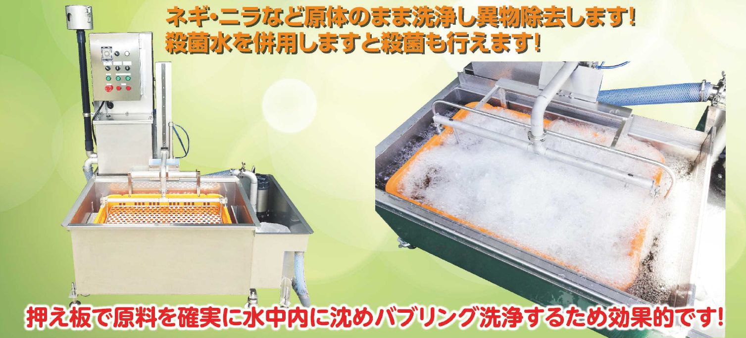 ネギ・ニラなど水に浮く食材を確実に水中内に沈めバブリング洗浄を行います。