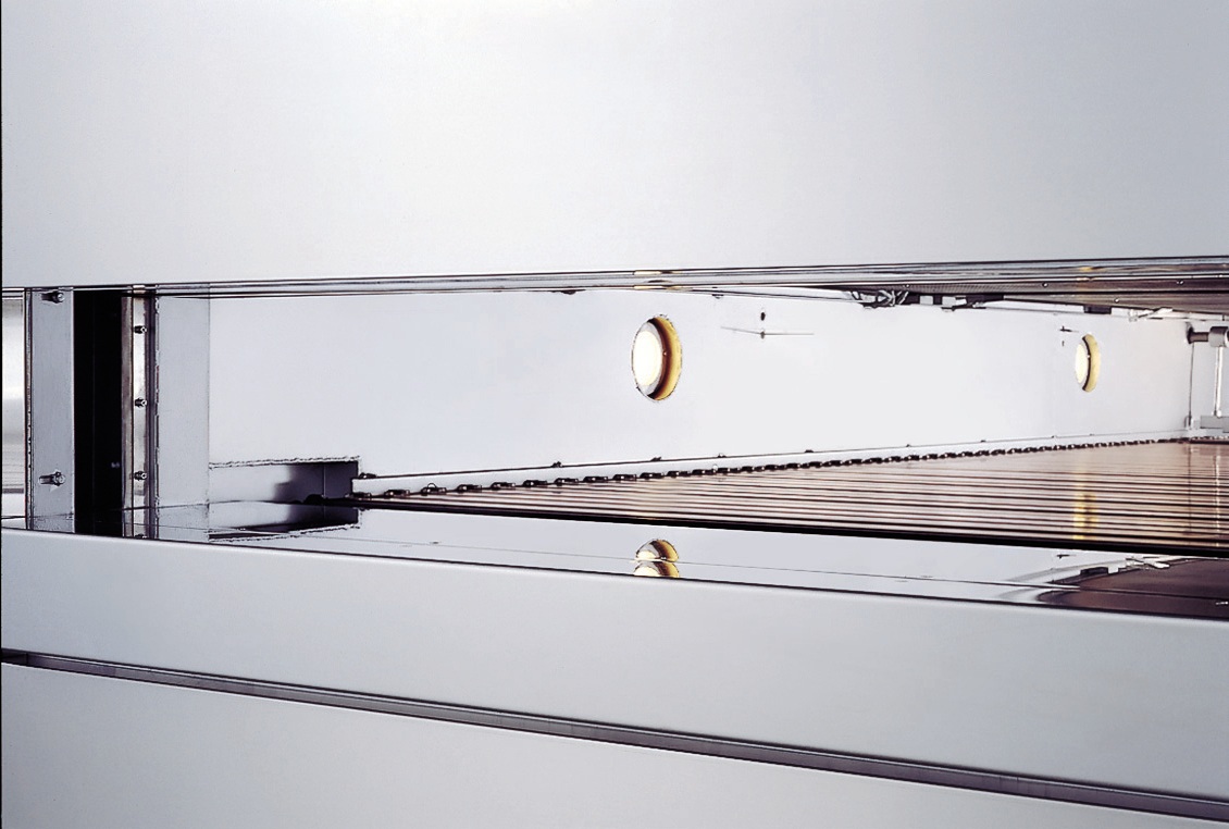 ノーピールオーブンは、キャタピラ運行式のオーブン炉床により、天板、ケースの搬入、搬出を自動化し、ハードな窯前作業を合理化した、サンコーのオリジナルオーブンです。