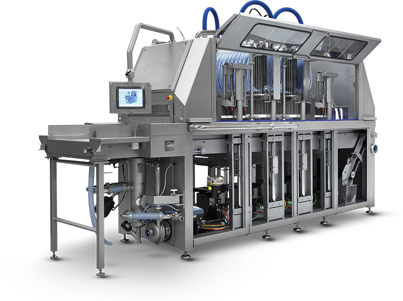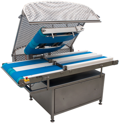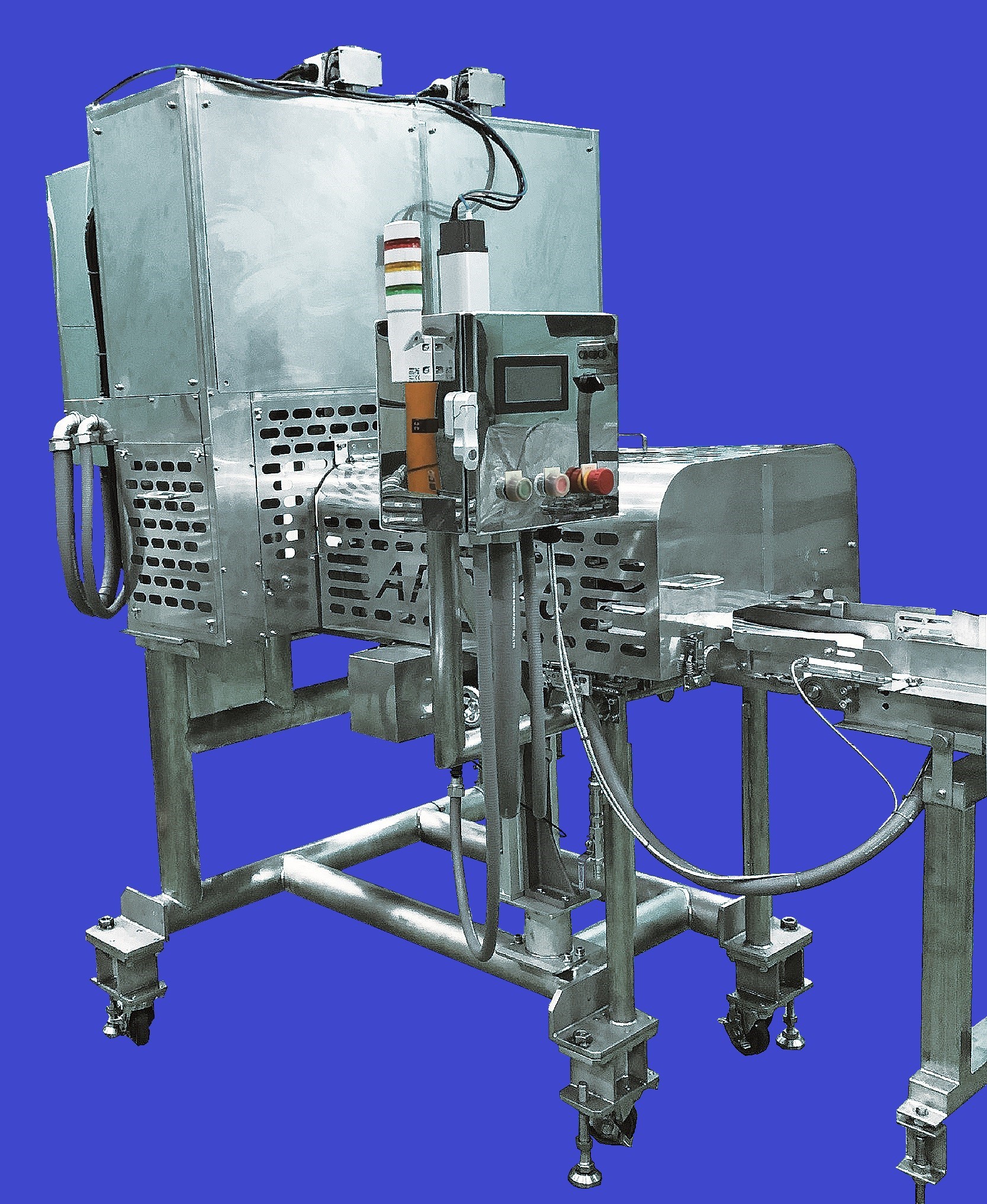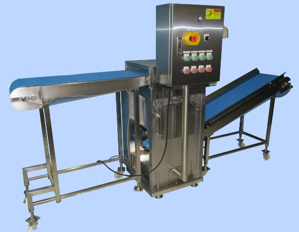 シンプルさと確実性を追求した自動開封機 APO-20。 鶏肉2kg用パックの開封を自動で行います。さまざまなパックに対応可能です。