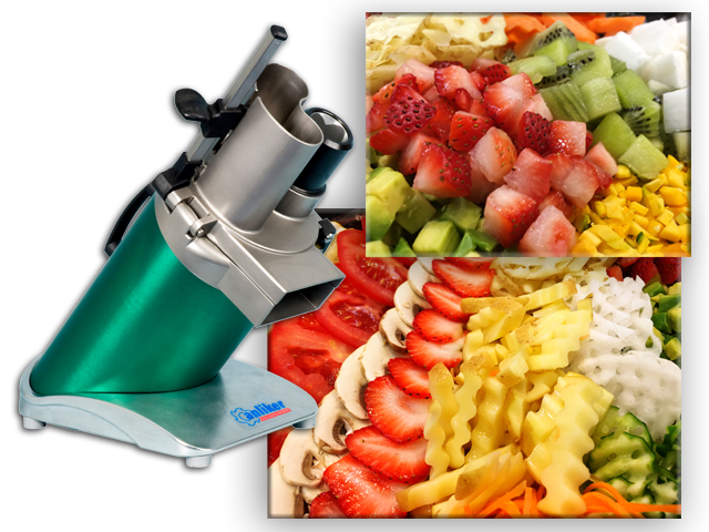 - ドローウィングカットを実現しとても正確なカットが可能です。柔らかいトマトや柑橘類のスライスがとても綺麗です。小型機は、コンパクトではありますが、大根を角切りでカットした場合、150kg/h の生産能力があります。
