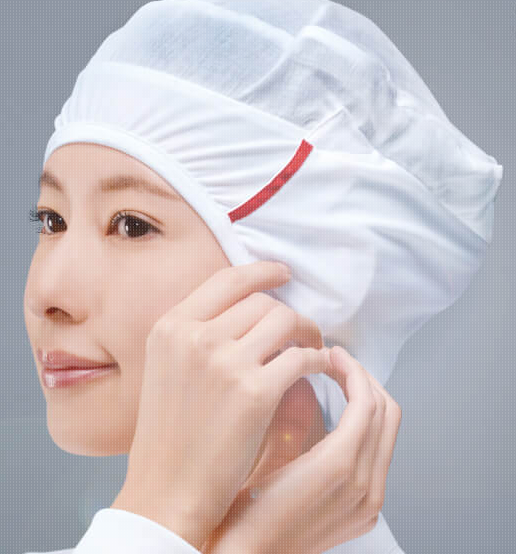 毛髪混入の原因となる間違い着用(着用の乱れ)が弊社独自の黄色ラインによって、周りの方が気付きやすくなるユニフォームです。