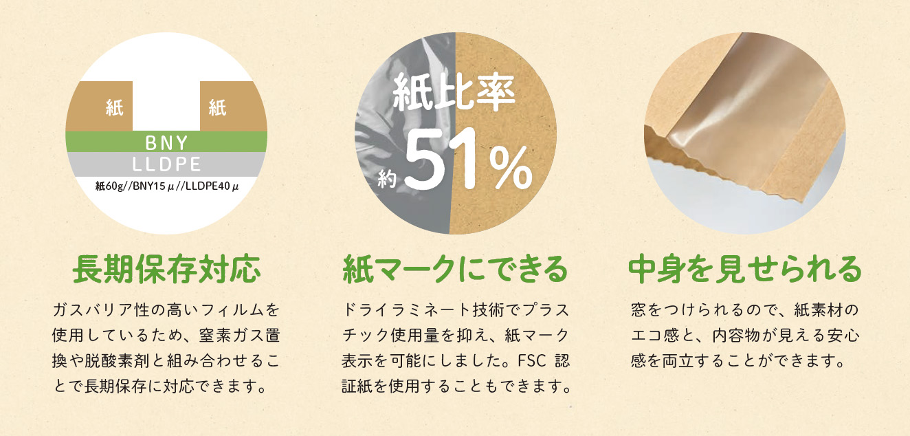 ガスバリア性の高いフィルムを使用しているため、窒素ガス置換や脱酸素剤と組み合わせることで長期保存に対応できます。