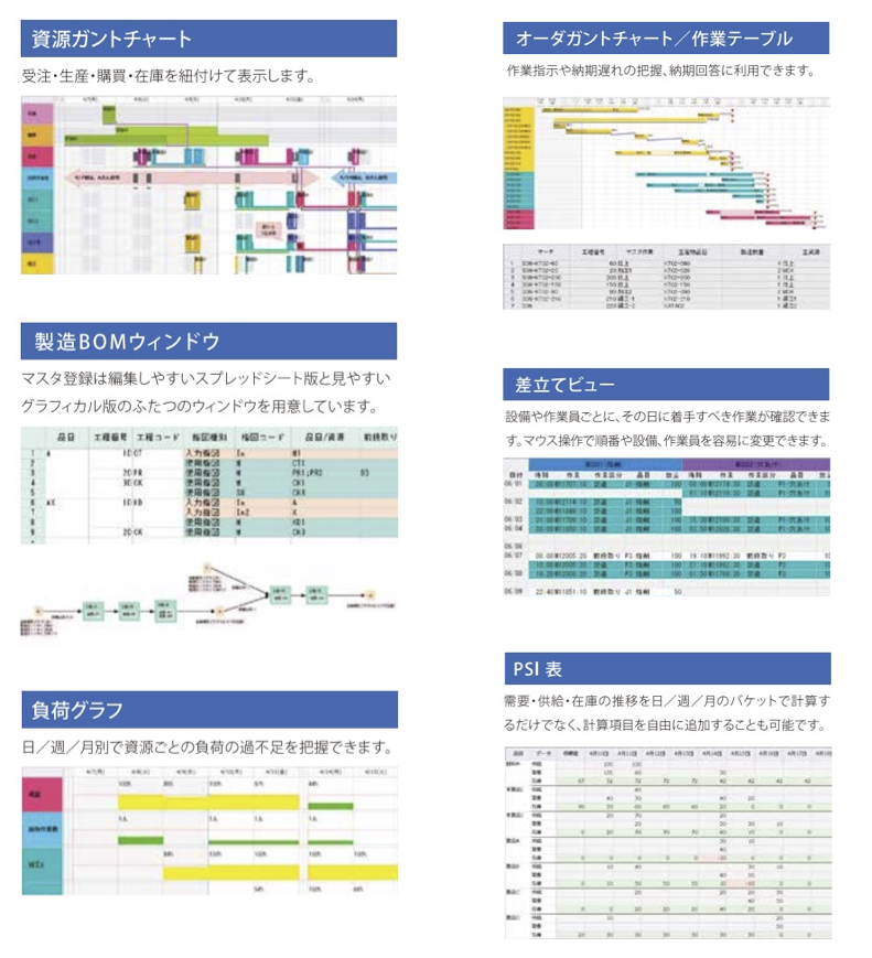 Y’s-SF Schedulerは、「いつ」「どこで(どの設備で)」「何を」「どの順番で」製造するか、多品種多工程の作業計画(工程スケジュール)を高速に作成するためのシステムです。設備や作業員の負荷状況、段取り替えなどを考慮した効率の良い計画を立てることが可能です。精度の高い計画により製造リードタイム短縮・在庫圧縮による生産性改善が見込まれ、計画作業の属人化解消につながります。※Asprova APSを標準採用しています。